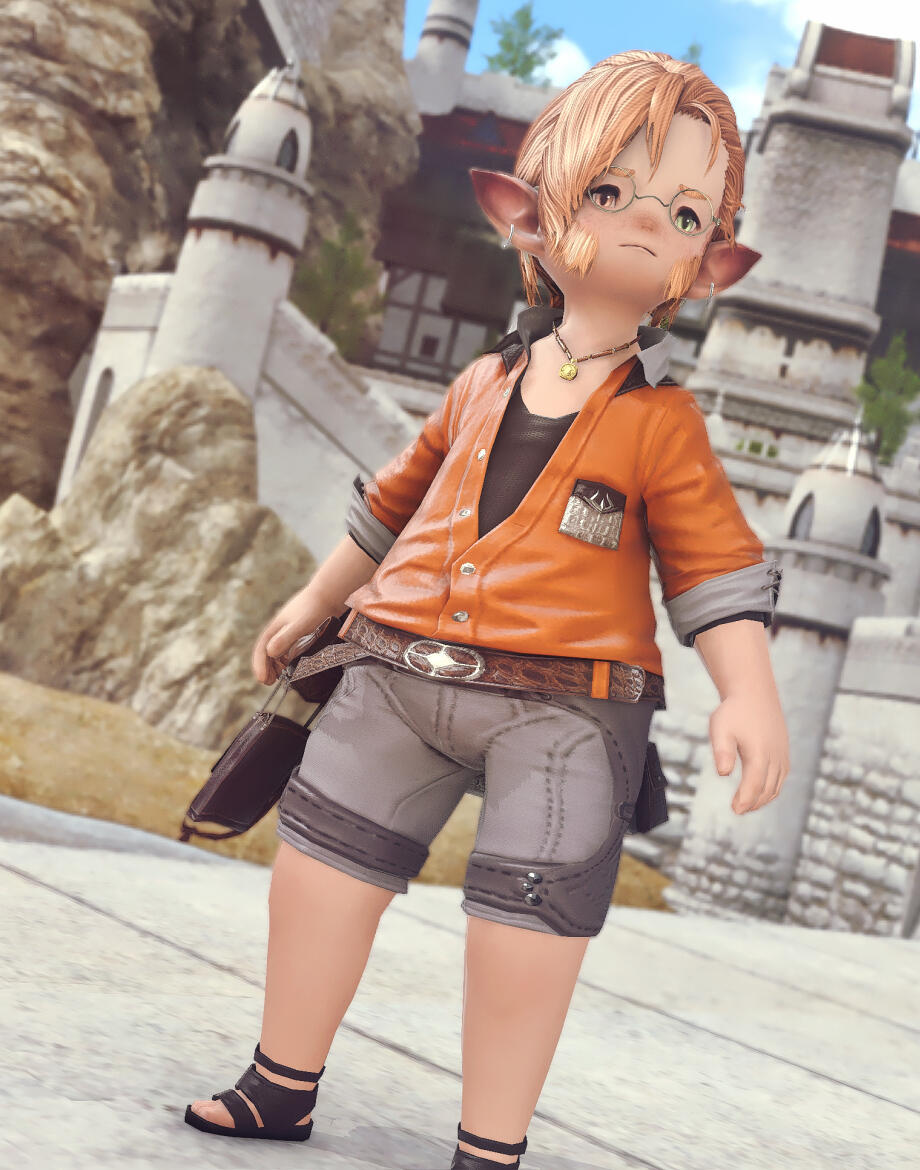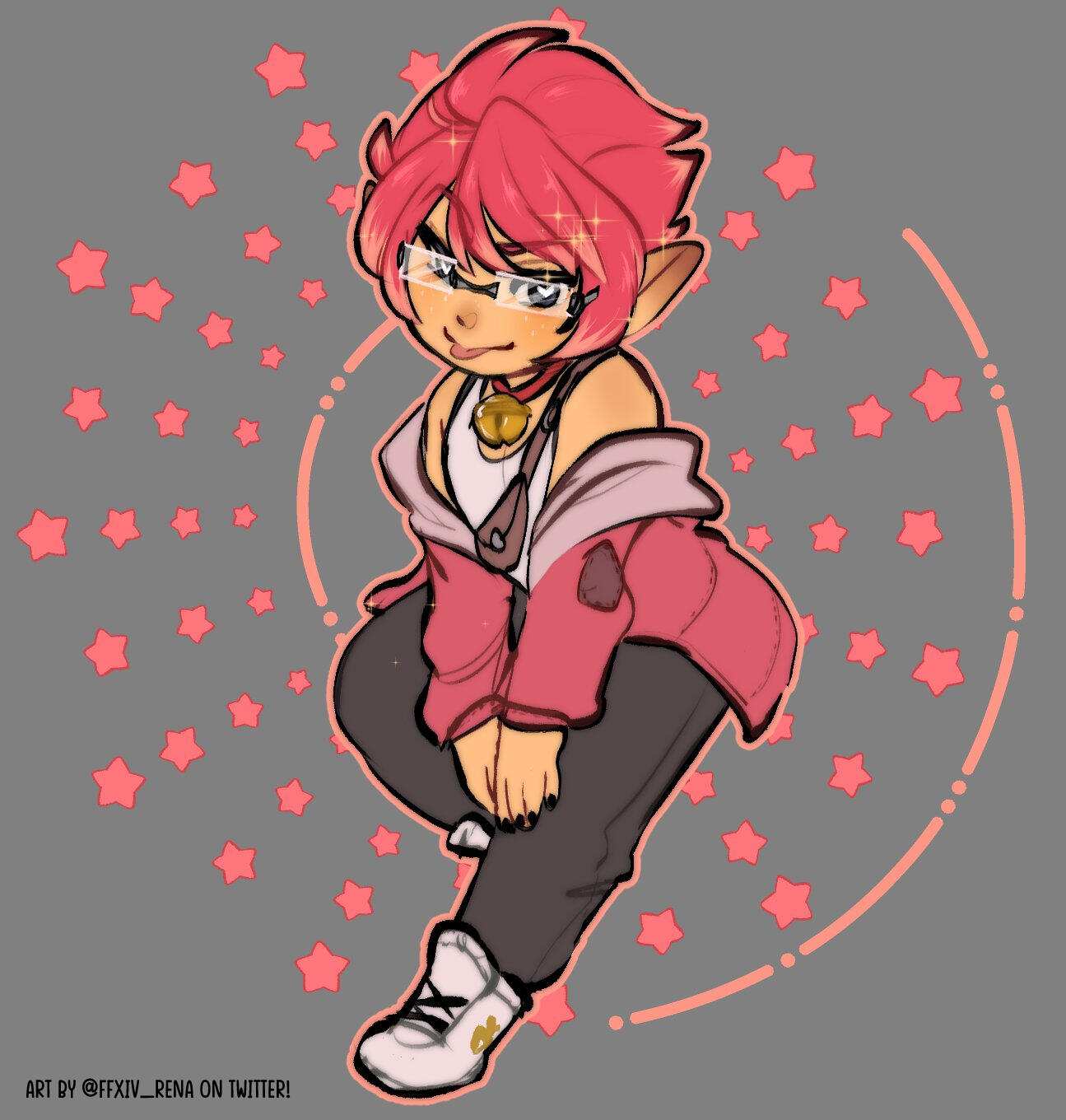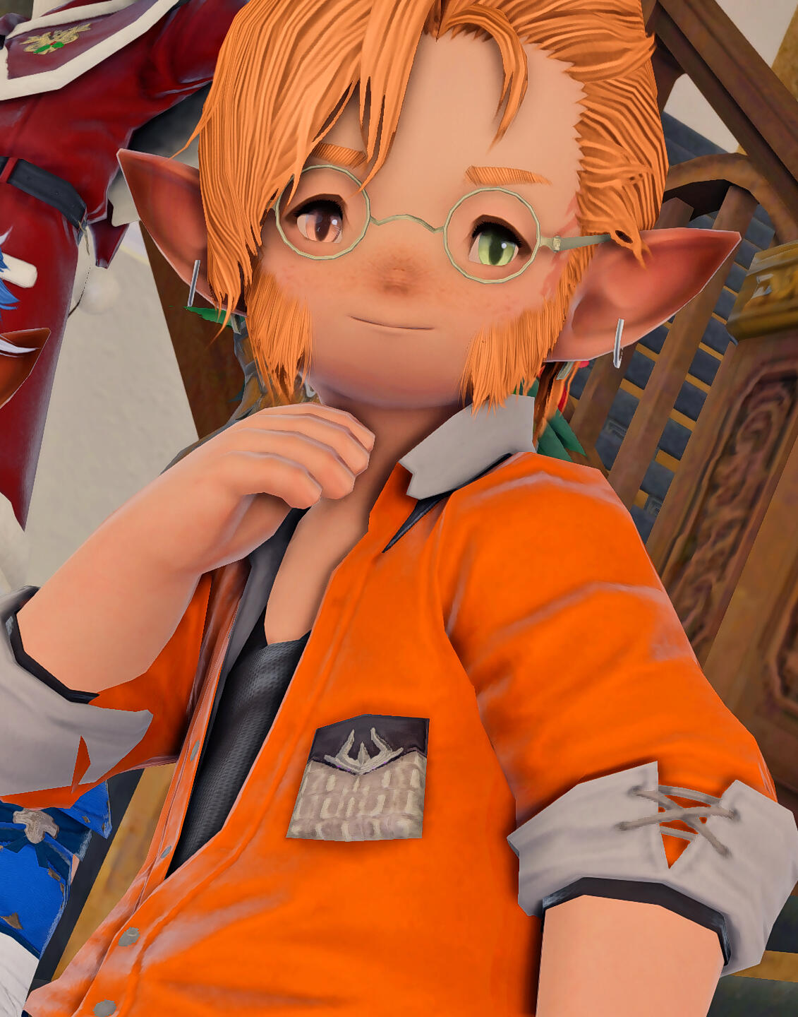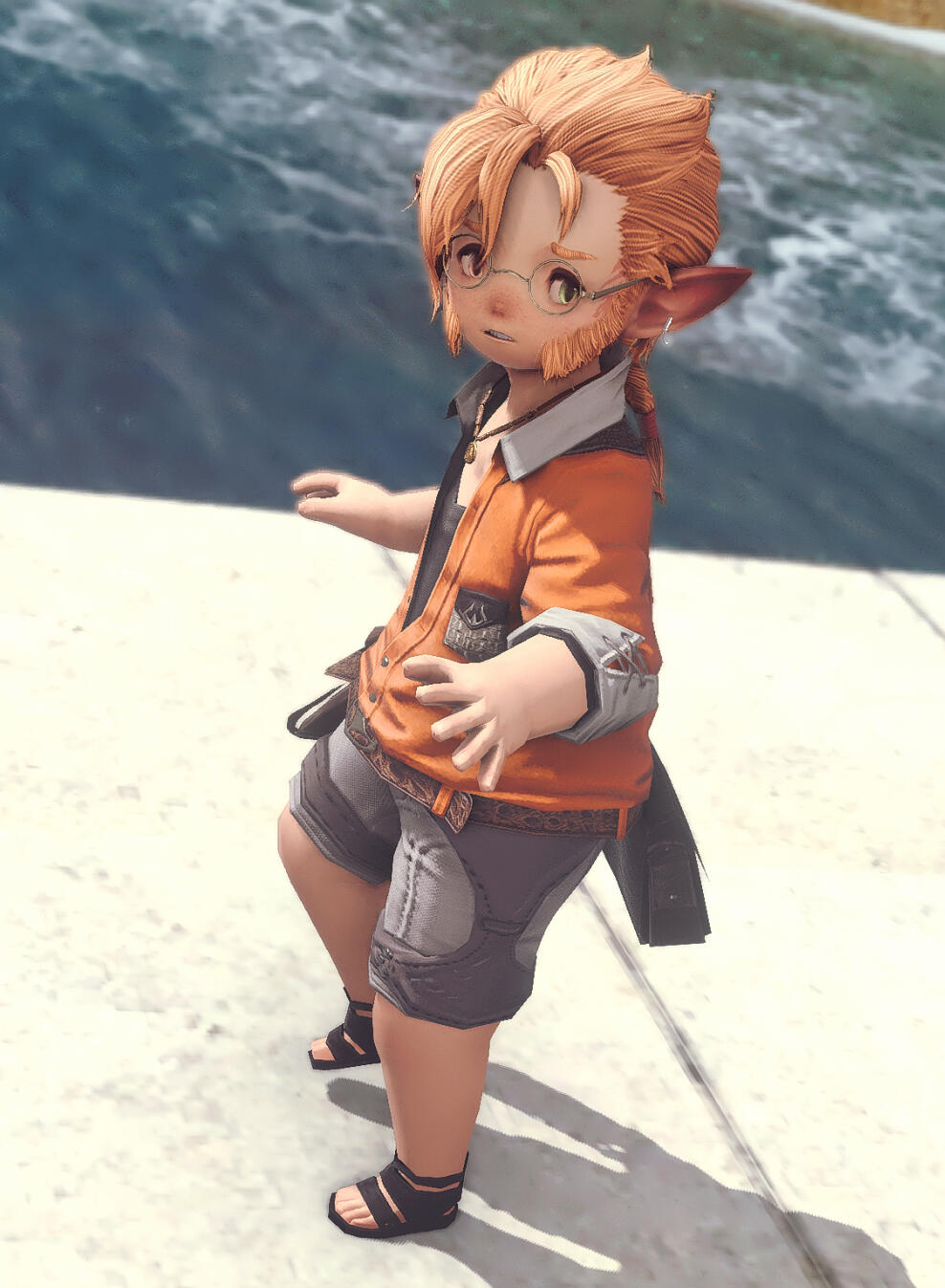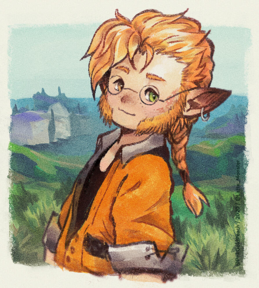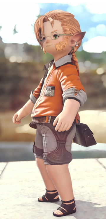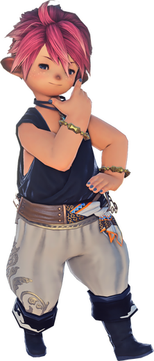 Dunesfolk LalafellAge: 28Gender: Male (cis, he/him)Main Class: Red Mage-------------------------------------------Height: 2'10" (min height)Eyes: Cool GreyPiercings/etc: One earring on left ear. Sometimes wears makeup glitter.-------------------------------------------Background: Born & raised in Ul'Dah, became an adventurer with financial support from his wealthy parents.Personality: Energetic, fun-loving, feisty, and has a penchant for mischief and self-indulgence. Has great love and generosity for his friends. Likes to help others if it doesn't inconvenience him too much. Has a big heart, but would like to pretend he doesn't.Likes: Seeing new places, expanding his culinary palate, teas + coffees + wine & mixed drinks, dried fruits & nuts and any kind of sweets incorporating those, being held and carried by large folk, The Gold Saucer, treating his friends to indulge with him.